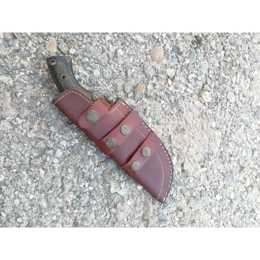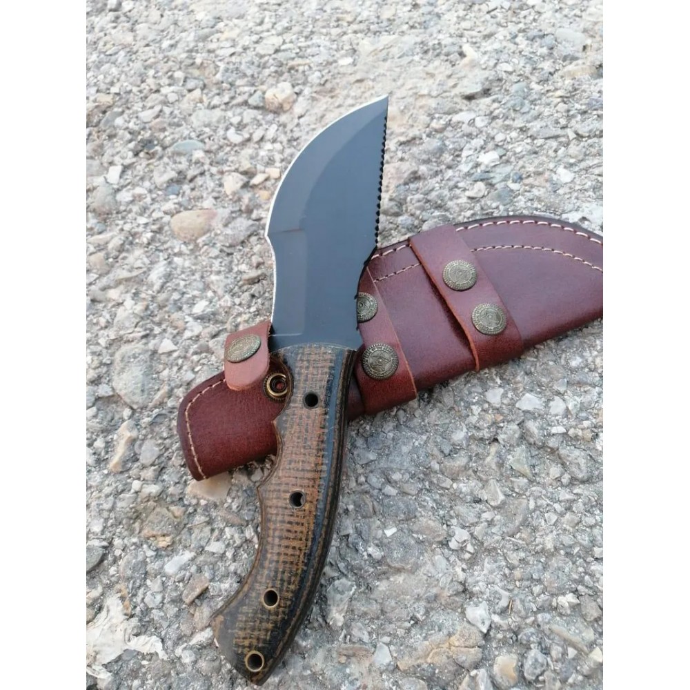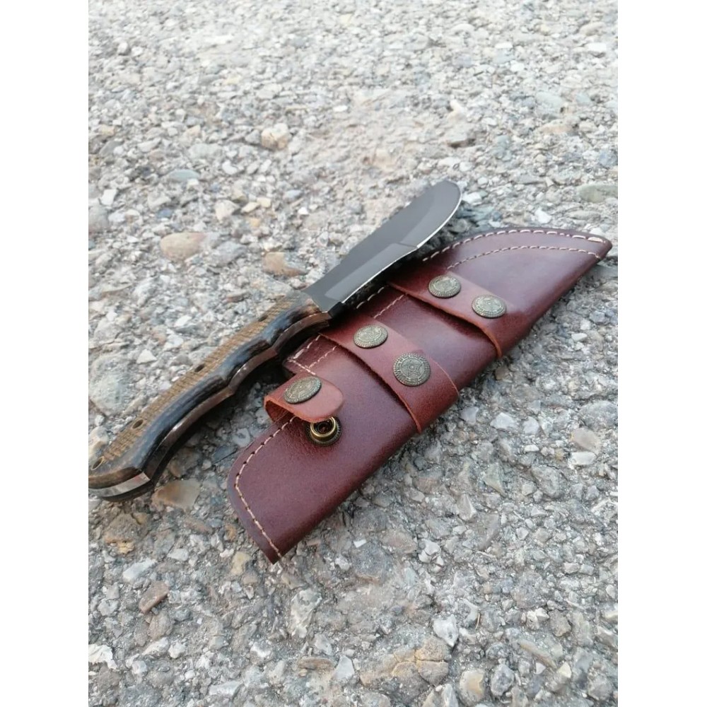 A tracker knife with a distinctive design. The blade is crafted from 1095 high carbon steel with black powder coating, known for its durability and ability to hold the edge. The handle is made from micarta sheet, which provides a secure grip and is resistant to wear and tear. The brass pipe rivets used to attach the handle to the blade , adding a touch of elegance to the overall design. A back brass pipe hole is also visible, suggesting that the knife have additional features and attachments. This tracker knife comes with the elegant leather cover, which helps protect the powder coated blade when not in use. Overall, this knife is a well-crafted tool suitable for various tasks such as hunting and camping and outdoor use
