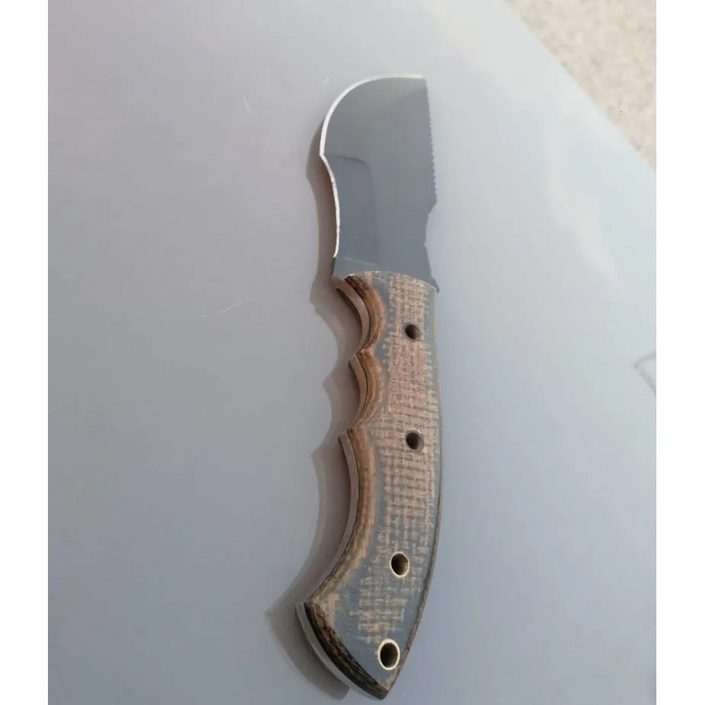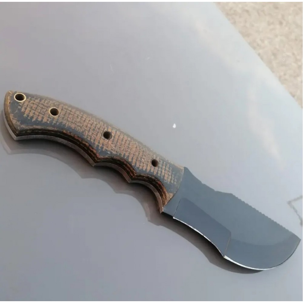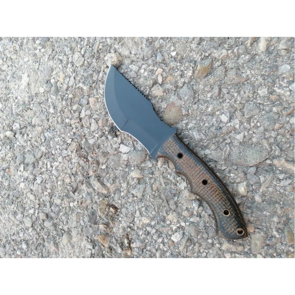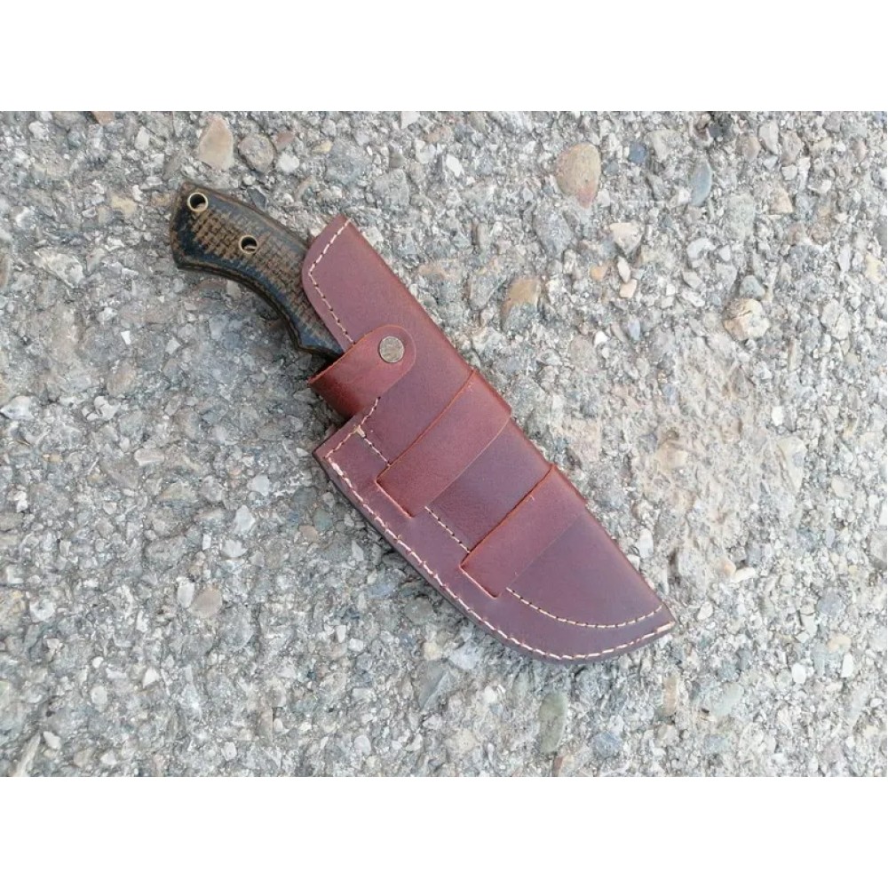 A tracker knife with a distinctive design. The blade is crafted from 1095 high carbon steel with black powder coating, known for its durability and ability to hold the edge. The handle is made from micarta sheet, which provides a secure grip and is resistant to wear and tear. The brass pipe rivets used to attach the handle to the blade , adding a touch of elegance to the overall design. A back brass pipe hole is also visible, suggesting that the knife have additional features and attachments. This tracker knife comes with the elegant leather cover, which helps protect the powder coated blade when not in use. Overall, this knife is a well-crafted tool suitable for various tasks such as hunting and camping and outdoor use