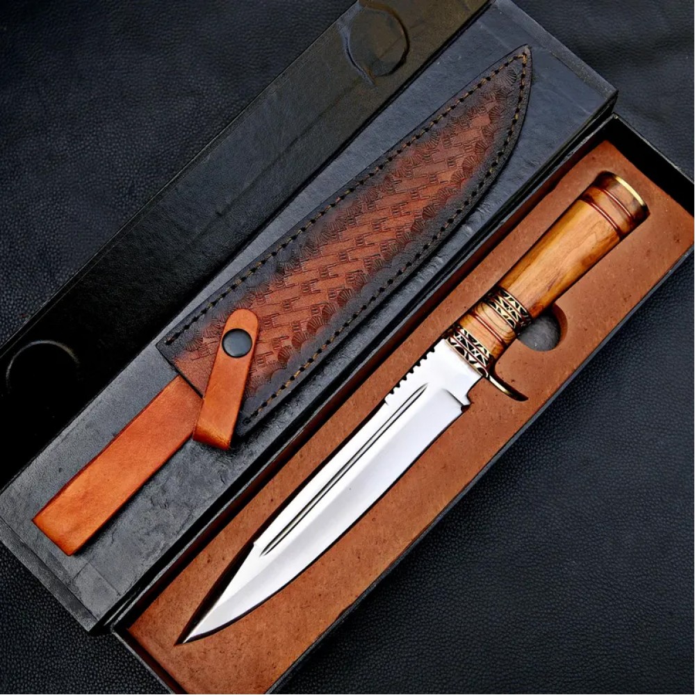 This handmade hunting knife is a blend of strength, beauty, and craftsmanship. Designed for outdoor enthusiasts, hunters, and collectors, the knife features a razor-sharp stainless steel blade paired with a solid wooden handle with brass accents for durability and comfort. Each piece is carefully handcrafted, making it unique and one of a kind.