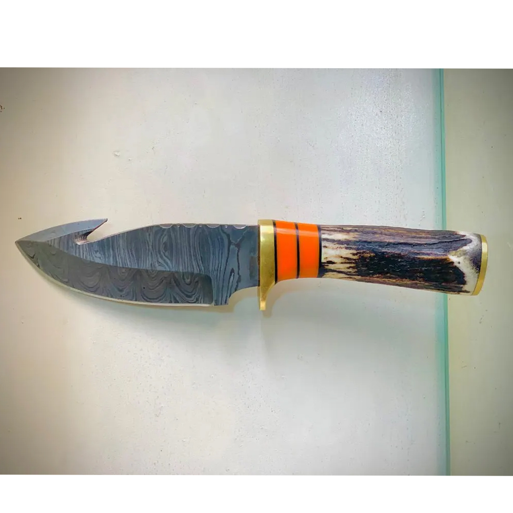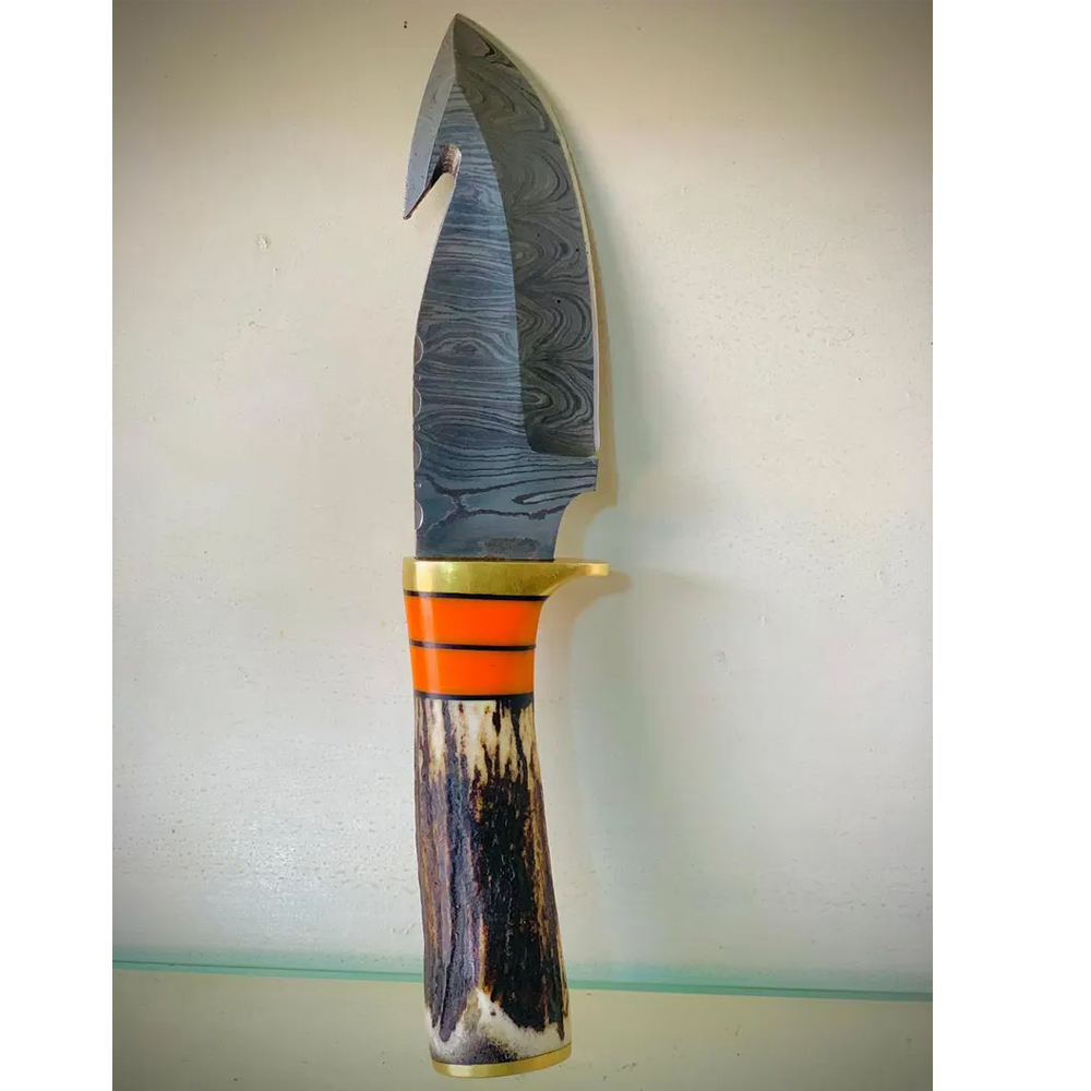 • Blade Type: Gut hook with Damascus-style finish (ideal for skinning and field dressing)
