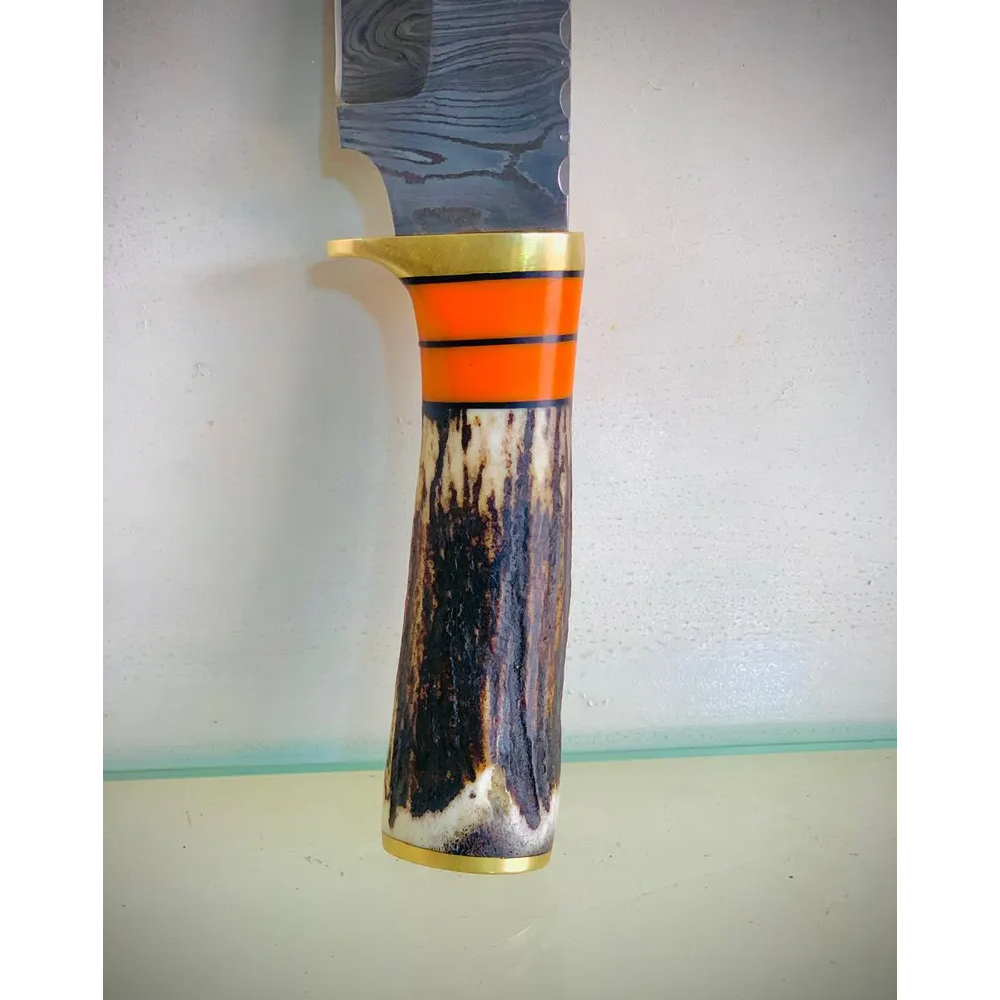 • Handle: Authentic stag antler with vibrant orange and brass accents for a secure, eye-catching grip