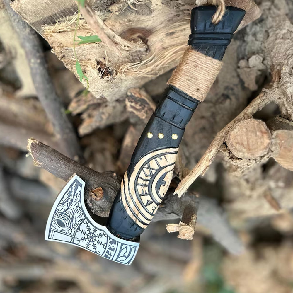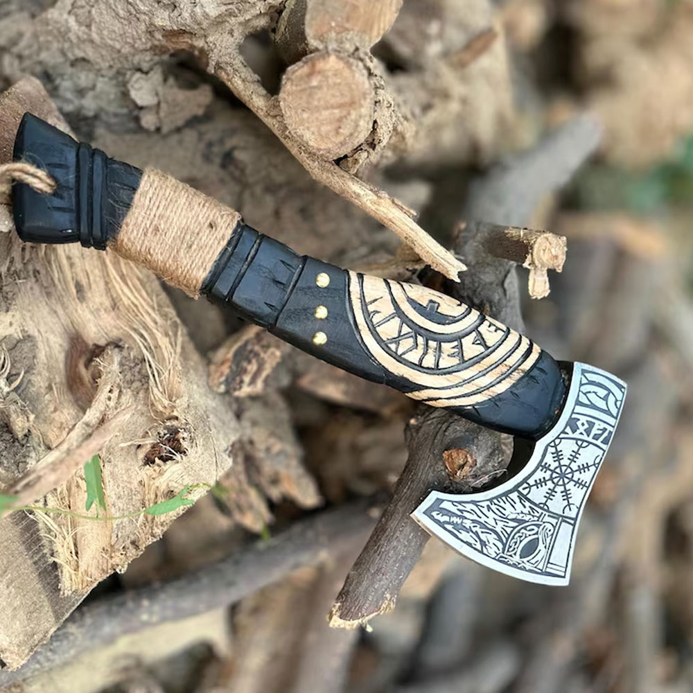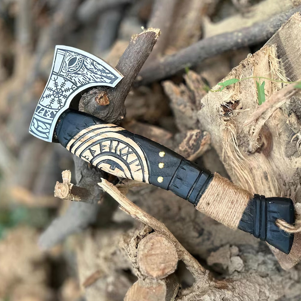 Handmade Viking Battle Axe Custom Gift Hand Forged Steel VIKING AXE Engraved Wood HandleUnleash your inner Viking warrior with this handcrafted battle axe, meticulously designed to replicate the legendary Norse items of old. Each axe is carefully forged from high-carbon steel, ensuring a strong and durable blade that's perfect for collectors, reenactors, and history enthusiasts alike. Features: - Hand-forged blade: Made from high-carbon steel for strength and durability - Wooden handle: Crafted from sturdy wood, wrapped in leather for a secure grip - Norse-inspired design: Intricately crafted to resemble the axes wielded by Viking warriors - Functional and decorative: Suitable for display, reenactments, or as a trusty companion for outdoor adventures - Unique and handmade: No two axes are alike, making each one a one-of-a-kind piece Specifications: - Blade length: 6*4 inches - Handle length: 22" approx - Materials: High-carbon steel, wood, Rope wrap Care instructions: - Keep dry: Store in a dry place to prevent rust - Oil regularly: Apply a thin layer of oil to maintain blade condition Viking Axe Care • Wipe clean & dry after every raid. • Oil blade lightly; oil handle quarterly. • Store upright in a dry place—avoid long‑term leather sheaths. • No prying, hammering, or dishwasher adventures. Keep your edge keen and your legend sharper.